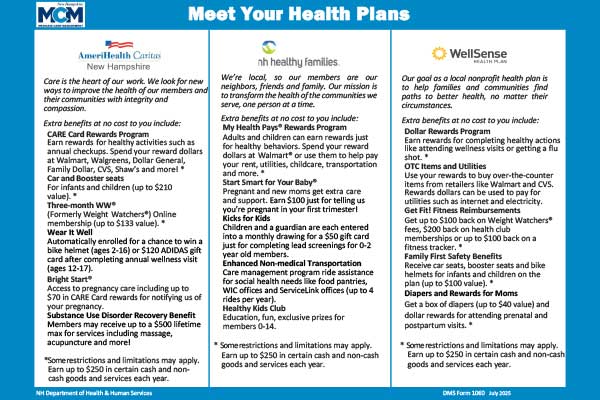 This guide from the New Hampshire Department of Health and Human Services outlines the Medicaid Care Management health plan options available. Families can compare benefits and find contact information to learn more or enroll.